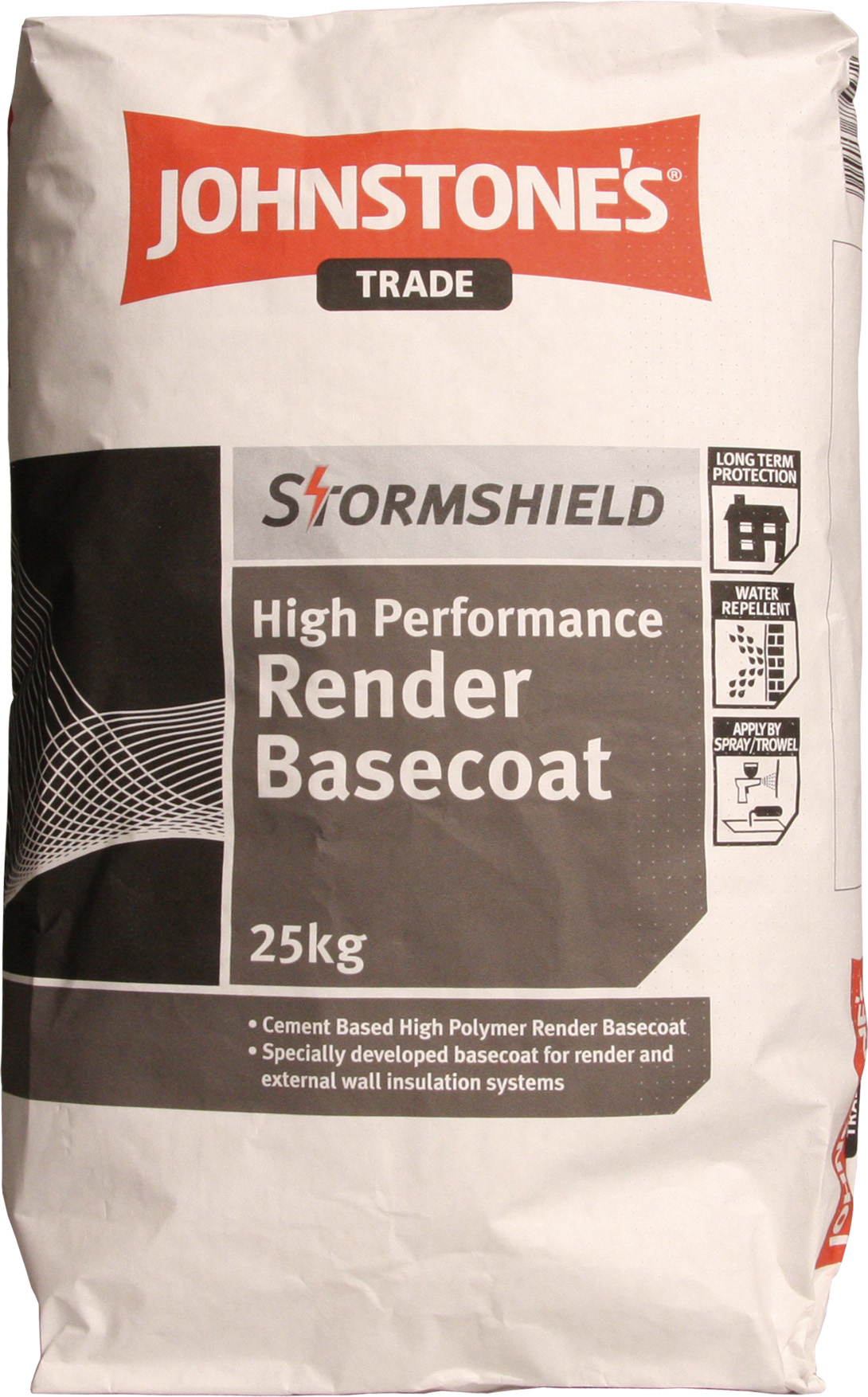 High performance cement based base coat for use with the Johnstone’s Stormshield system. Ideal for use on brick and masonry, rendeboard or insulation. 2.6m2 at 6mm thick / 1.5m2 at 10mm thick per bag. 6m/2 as adhesive