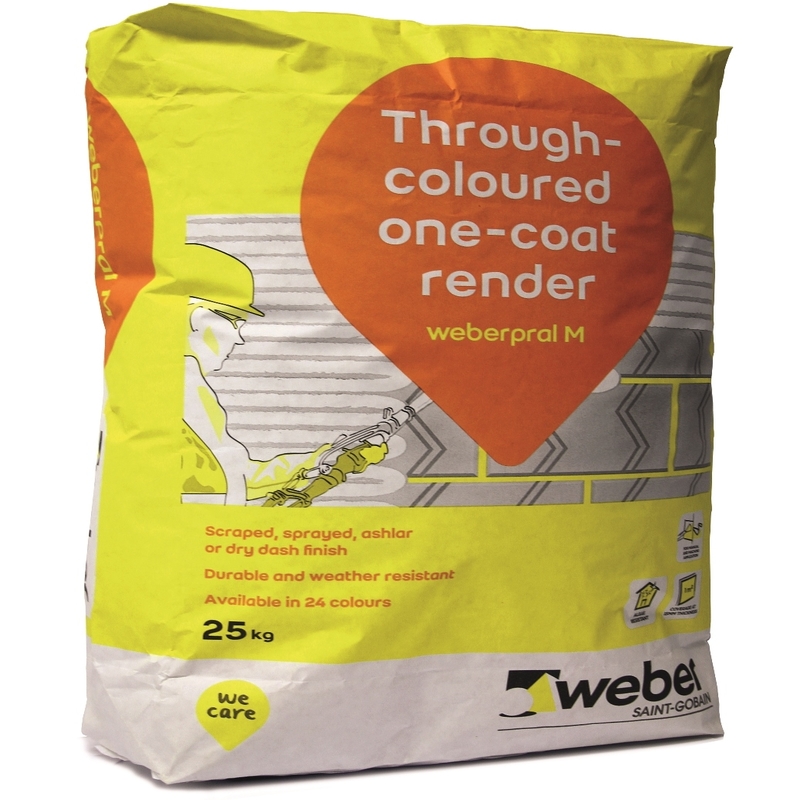 Weberpral M is a one-coat, ready-mixed, cementitious, weather resistant, external decorative, through-coloured render, suitable for most types of brick or blockwork.